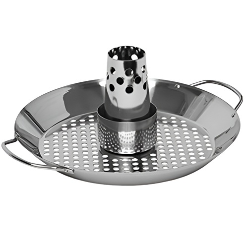 Данная модель подходит для использования на угольном и газовом гриле. Вы сможете одновременно приготовить сочную и нежную курочку и гарнир на компанию из 4-6 человек.Чтобы птица получилась максимально вкусной, в центральную емкость налейте пенное и добавьте любимые специи. Установите ростер с курицей в зону непрямого жара и готовьте при температуре 180 градусов под закрытой крышкой. Для придания блюду дымного аромата рядом с ростером можно установить контейнер с замоченной щепой.