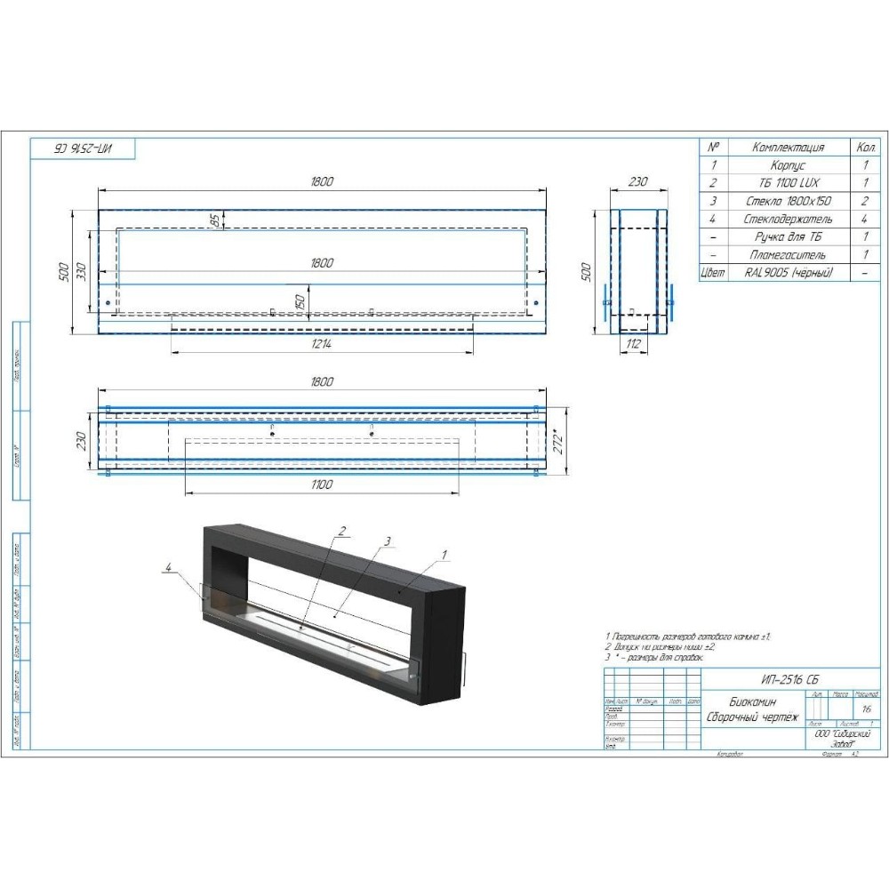 Инструкции, чертежи, документы - Биокамин SappFire Tunnel 1800