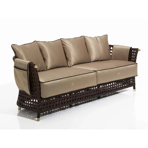 Трехместный диван Rigel имеет каркас из натурального ротанга, плетение выполнено из сыромятной кожи, которая является культовым элементом коллекции Orangerie. Сыромятная кожа - это высокопрочный, роскошный натуральный материал, изготовленный из кожи животных (ягненка, теленка). Ее разрезают на тонкие полоски, которые затем сплетают. Такая кожа подходит для окрашивания, а добавление клея повышает эстетичность и прочность изделия, защищая его в течение длительного времени. Натуральное плетение - это кропотливый процесс, который выполняется исключительно внутри компании DFN опытными мастерами-ремесленниками. Каждое изделие получается уникальным и отдает дань уважения великой классике - узору венской соломы. Диван характеризуются наличием мелких деталей, таких как ручки, хромированные ножки и карман для журналов.