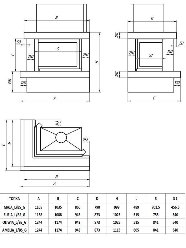 Инструкции, чертежи, документы - Каминная облицовка FireBird Ладога (для топки Maja/LP/BS/G) (угловое стекло слева-справа, гильотина)