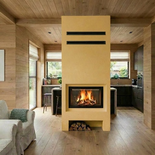 Камин подходит для монтажа в домах с деревянными стенами и перекрытиями