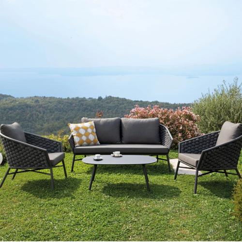 Лаконичный комплект плетеной лаунж мебели Dub придает любому пространству на открытом воздухе оригинальность и эксклюзивность. Плавные линии, плетение, изготовленное из мягкого и прочного каната делает набор стильным и модным, а также отличным решением для обустройства зон отдыха на защищенных открытых пространствах. Dub поможет создать расслабляющую атмосферу для отдыха в лаунж зонах летних кафе или на верандах ресторанов, но также подойдет для использования в частных проектах.