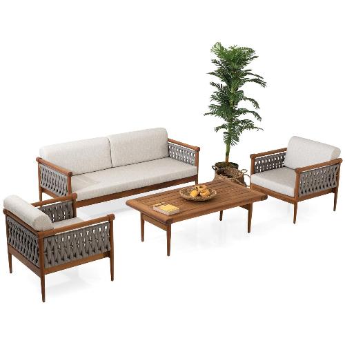 Комплект мебели Knob отличается своей долговечностью, устойчивостью к сезонным изменениям, солнечному свету и другим внешним факторам и представляет собой долгосрочную инвестицию. Использование эксклюзивных материалов, таких как дерево ироко, тщательное мастерство плетения из роупа ручной работы и особые свойства тканей для уличного использования - все это украсит Ваше жилое пространство и позволит максимально насладиться отдыхом на свежем воздухе.