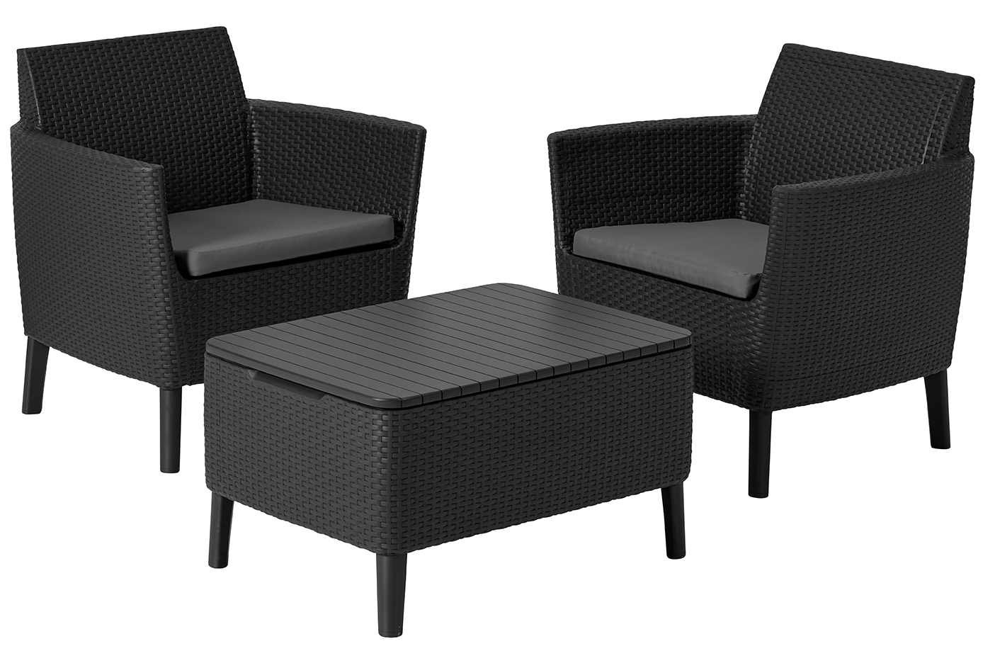 Элегантное дополнение к любому жилому пространству на открытом воздухе. Комплект Салемо включает два стула и один стол для хранения, все они сделаны из прочного, всепогодного пластика, которая может похвастаться стильной плетеной текстурой и гладкой фактурной столешницей. Кресла оснащены мягкими подушками, которые помогут вам расслабиться стильно и с полным комфортом. Набор идеально подходит для компактных помещений, легкий и простой в сборке.
