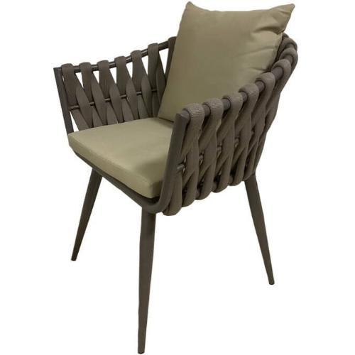 Уличное кресло с эргономичным и современным дизайном с алюминиевым каркасом и спинкой в плетении из роупа. Модель подходит для открытой террасы бара, ресторана, отеля или небольшого частного зимнего сада.