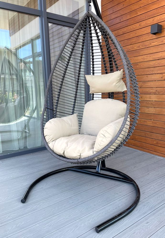 Плетение - мононить, алюминиевый каркас кресла. Стальная штанга и основание подставки.
