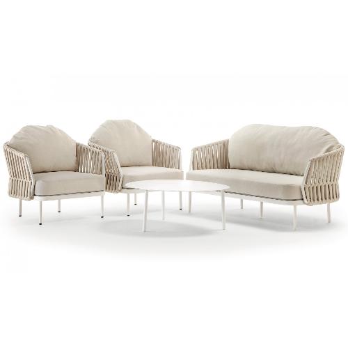 Уличный комплект Soho состоит из двухместного дивана, двух кресел и журнального столика со столешницей из алюминий. Алюминиевый каркас оплетен роупом (полиэстер и резина), мягкие подушки на сиденьях и спинках со съемными чехлами из олефина, устойчивого к загрязнениям и ультрафиолетовому излучению.