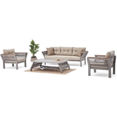 Красивый уличный комплект мебели для отдыха Vicenza, включающий трехместный диван, два кресла и кофейный прямоугольный столик, идеально подходит для использования на террасах отелей, ресторанов и кафе, а также в частных домах, где важно создать уютную зону для отдыха. Его алюминиевый каркас обеспечивает прочность и долговечность, а плетение из роупа придает мебели стильный вид, подчеркивая ее современный дизайн. Столешница кофейного столика из керамики обеспечивает устойчивость к влаге и механическим повреждениям. Подлокотники дивана и кресел из дерева ироко придают комплекту естественную красоту и природный комфорт. Подушки со съемными чехлами из олефина не только добавляют уюта и мягкости, но и легко могут быть чистыми и ухоженными в любое время. Такой комплект мебели станет привлекательным и функциональным решением для обустройства открытых пространств любого заведения или дома.
