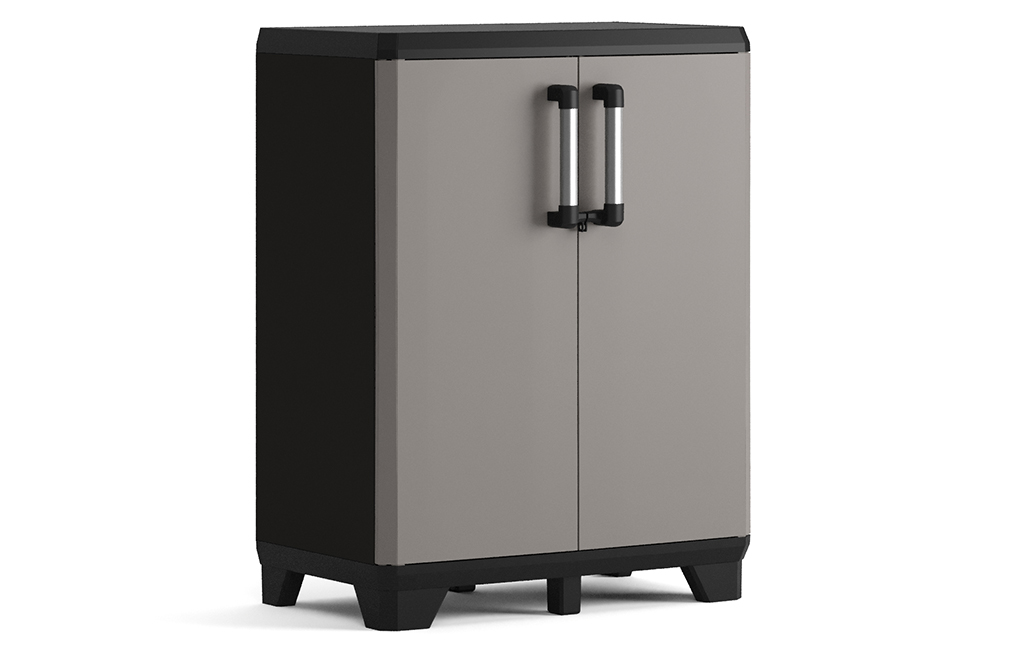 Pro — это современный шкаф, характеризующийся черно-серой конструкцией, алюминиевыми ручками и 2 полками с металлическим усилением, каждая из которых выдерживает нагрузку 20 кг. Он оснащен защелкой с навесным замком, а также центральным и угловым ребрами жесткости на задней части рамы, которые обеспечивают дополнительную устойчивость шкафа.