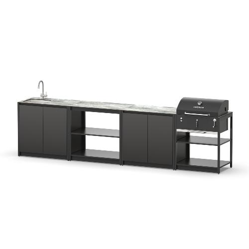 Сборная мангальная зона из четырех модулей с мойкой, столешницей и угольным грилем.Размер мойки: