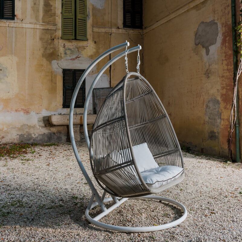 Каркас выполнен из алюминия, окрашенного в белый цвет. Плетение изготавливается вручную из высококачественного полираттанового волокна REHAU® (полиэтилен высокой плотности).