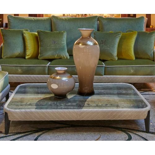 Столешница кофейного столика Aralia толщиной 10 мм выполнена из керамики с отделкой под мрамор. Яркие поверхности, соблазнительные цвета и очень эмоциональные прожилки превращают керамику в настоящий предмет интерьера с отличными характеристиками для использования на открытом воздухе, такими как водостойкость, защита от УФ-лучей, водонепроницаемость, устойчивость к истиранию и пятнам. Столешница столика также может быть выполнена из лакированного или дымчатого закаленного стекла и натурального мрамора.