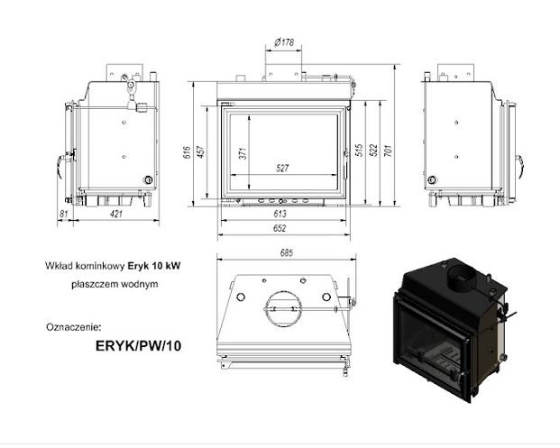 Инструкции, чертежи, документы - Каминная топка Kratki Eryk/PW/10/W