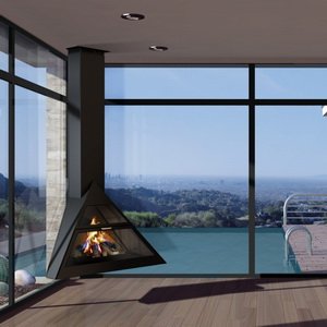 В ситуации, когда необходима обзорность огня с любой точки, используют камины цилиндрической или кубической формы, располагая их в центре помещения. В ассортименте островных каминов представлены подвесные камины, прикрепляемые непосредственно к потолку.